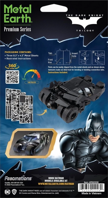 Premium set Metal Earth omogućuje vam sastavljanje realistične metalne replike legendarnog vozila BATMAN Tumbler. Dijelovi su izrezani od kvalitetnih čeličnih pločica i ukrašeni finim laserskim graviranjem za maksimalnu autentičnost. Rezultat je izdržljiv i detaljan model koji će se istaknuti na polici svakog obožavatelja.