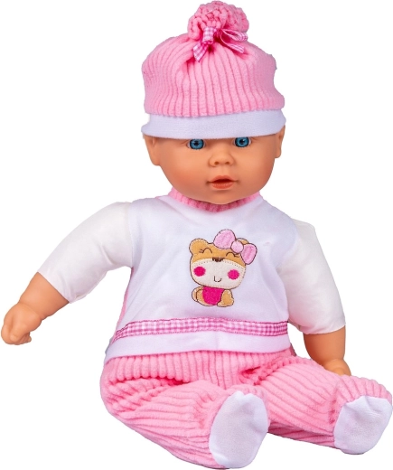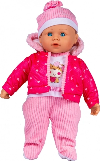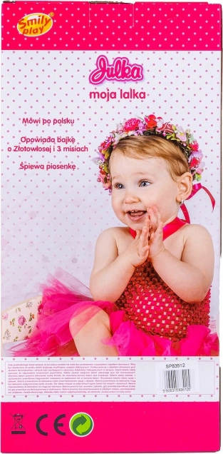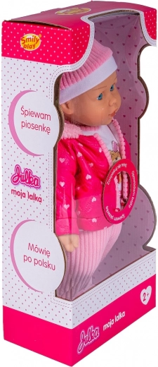 Lutka Julka uživa kada se o njoj brinete i vodite je u šetnju. Mekana lutka odjevena je u kapu, šal, kombinezon s prugastim hlačama i ružičastu prošivenu jaknu s kapuljačom obrubljenom prugastom tkaninom u boji hlača.