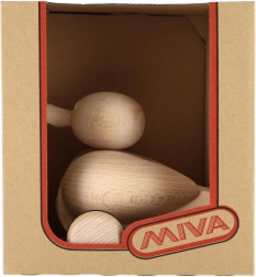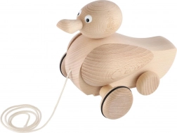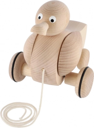 Ova klasična vučna igračka izrađena je od prirodnog drva i dizajnirana za sigurnu i zabavnu igru. Patka se tijekom vožnje simpatično pomiče i miče glavom, čime potiče djecu na daljnje korake i istraživanje. Ističe se čvrstom konstrukcijom i glatkim rubovima za udobno držanje malim ručicama.