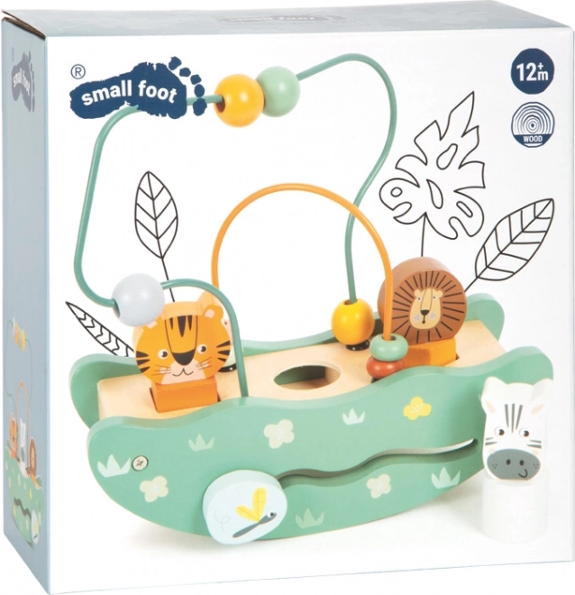 Drvena igračka s motivom safarija uključuje šarene perlice i životinjske figurice lava, tigra i zebre za razigrano učenje.