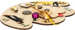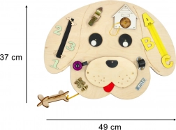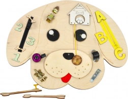 Zabavna drvena didaktička ploča u obliku psa potiče kod djece finu motoriku, logiku i koncentraciju. Sadrži šarene drvene brojke i slova, patentni zatvarač, kopče i zasune, zvonce te druge interaktivne elemente koji podržavaju učenje kroz igru i senzorni razvoj.