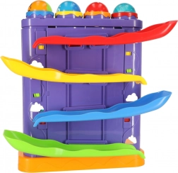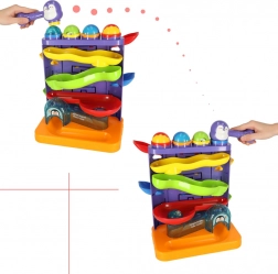 Zabavna i šarena kuglična staza 3-u-1 za djecu od 3 godine nudi dva odvojena kruga – jedan za kuglice i drugi za autić. Uz pomoć čekića djeca pokreću kuglice iz gornjih otvora i prate njihov spust. Igra razvija finu motoriku, koordinaciju oko–ruka i na prirodan način objašnjava principe gravitacije. U kompletu su 4× kuglica, autić i čekić.