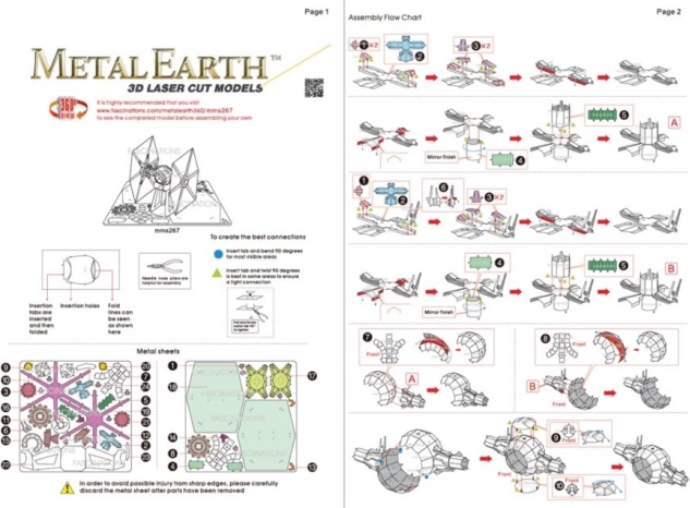 Pojedine dijelove izvadite iz metalnih pločica; po potrebi upotrijebite male kliješta za rezanje (nisu uključena). Dijelovi se spajaju pomoću zasuna koji se sastoje od jezička i otvora. Jezičak savijte pomoću malih tankih kliješta (nisu uključena) i postupno spojite sve zasune dok ne dobijete vrlo realističan majstorski komad!