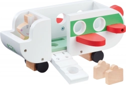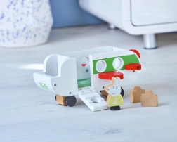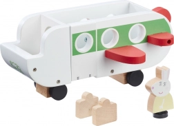 Avion je izrađen od ekološki prihvatljivog FSC drva s postojanim kolor tiskom. Potiče razvoj mašte, fine motorike i samostalnu igru djece od 2 godine. Paket sadrži figuricu gospođe Zec, 2 kovčega i kabinu s 4 sjedala – spremno za trenutačni polijetanje.