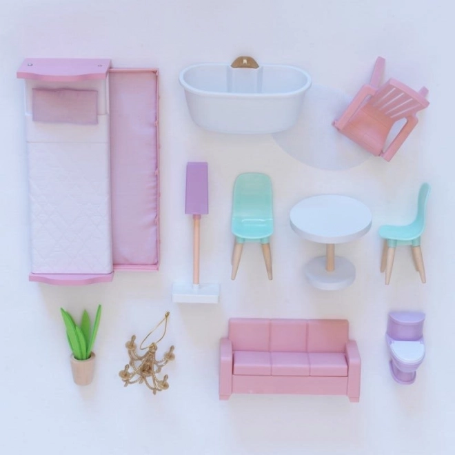 S dva kata, dvjema sobama i zasebnom kupaonicom kućica nudi dovoljno prostora za igru s lutkama i dodacima. Priloženih 12 komada namještaja omogućuje da odmah započnete i mijenjate raspored prema mašti.