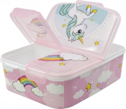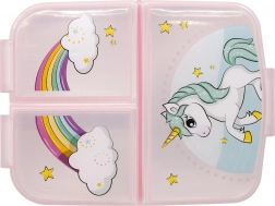 StilskI multi box za užinu s veselim motivom jednoroga i duge pomaže djeci održati hranu pregledno odvojenu i svježom. Tri zasebna pretinca idealna su za voće i povrće, sendvič i male grickalice. Čvrsta konstrukcija odolijeva uobičajenim padovima i udarcima, pa je kutija izvrsna za svakodnevnu upotrebu.