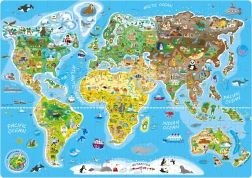 Karta svijeta kao zabavno učenje – dječje puzzle s ilustracijama znamenitosti (Eiffelov toranj, piramide, Kip slobode), prirodnih ljepota i tipičnih životinja pojedinih područja. Odlično za zajedničke trenutke i samostalnu igru, koje podržavaju geografsku orijentaciju, rječnik i logičko razmišljanje.