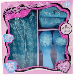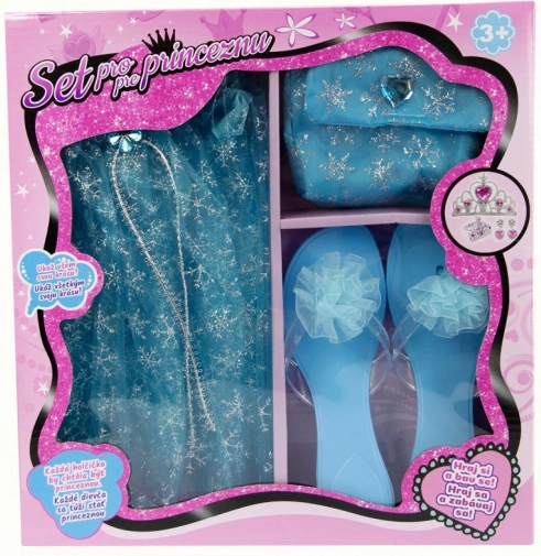 Ovaj očaravajući set u plavoj boji pomoći će djeci da lako stvore izgled prave princeze. Zahvaljujući kombinaciji suknjice, cipelica i torbice, spreman je za trenutačnu upotrebu te potiče maštu i kreativno kostimiranje.
