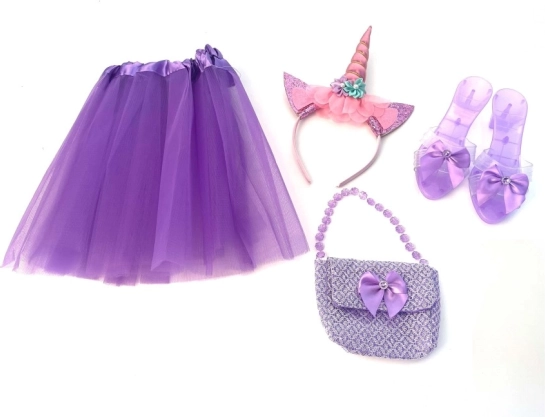 Ispunite san svake male princeze ovim potpunim setom za preoblačenje – sadrži cipelice, torbicu, suknjicu i traku za kosu, idealno za igru uloga i razvoj mašte.