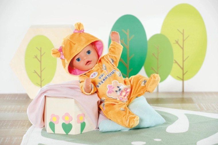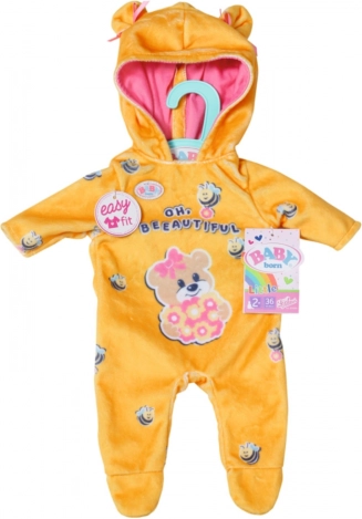 "Bum, bum!!! Što to brunda u dječjoj sobici? BABY born Little obukla je medeno žuti kombinezon i igra se velikog medvjeda. Ali s preslatkim uškama na kapuljači izgleda više kao slatko medo. Uške su dodatno ukrašene ružičastim mašnicama. Kombinezon je šivan u stilu 'easy fit', pa presvlačenje bez teškoća uspijeva i najmanjim ručicama. Na slici koja krasi plišani kombinezon, medvjedića dama upravo hrani pčelice cvjetnom poslasticom.