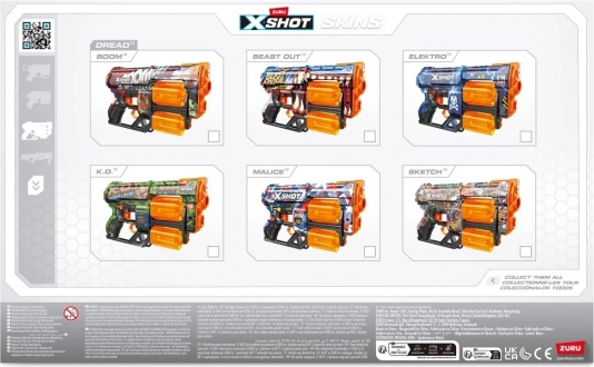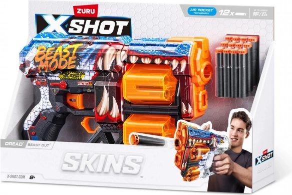 Pripremite se za adrenalinske dvoboje s blasterom X-SHOT SKINS DREAD u upečatljivom skinu beast mode. Dva neovisna rotirajuća bubnja zajedno pružaju 12 brzih hitaca – čim jedan ispraznite, dovoljno je prebaciti i nastaviti s akcijom bez zastoja. Ergonomski dizajn i lagana konstrukcija osiguravaju udobno držanje i pri duljoj igri.