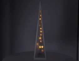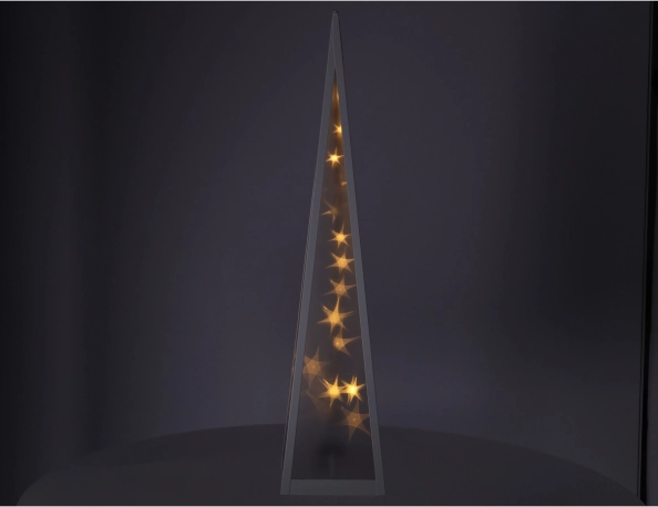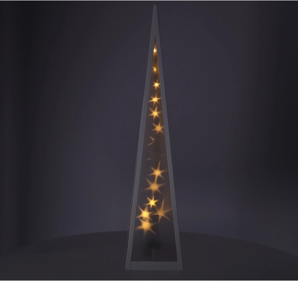 Plastična piramida s bijelim metalnim okvirom ispunjena zvjezdicama koje se kreću u sredini piramide ✨