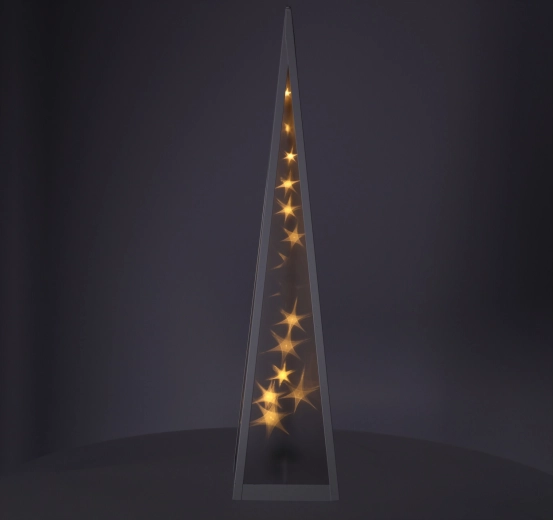 Plastična piramida s bijelim metalnim okvirom ispunjenim zvijezdama koje se kreću u središtu piramide ✨