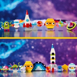 Ovaj kreativni set poziva male istraživače u svijet svemira: sastavite raketu, astronautkinju, zabavnog vanzemaljca i mini Sunčev sustav (Mars, Zemlja, Sunce i Saturn s prstenovima). Zahvaljujući živim bojama, raznolikim dijelovima i svjetlećim elementima djeca lako prepravljaju i istražuju nove kombinacije.