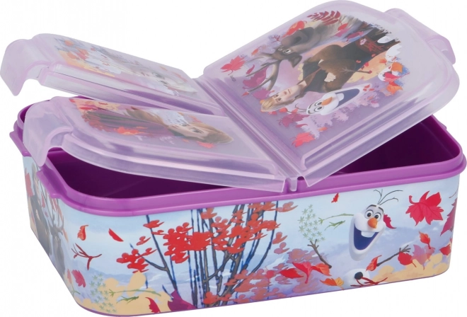 Dječja višenamjenska kutija za užinu sa službenom licencom FROZEN II oduševit će lijepim dizajnom i promišljenom unutarnjom podjelom. Tri odvojena odjeljka omogućuju razdvojiti voće i povrće, sendvič i male grickalice, tako da užina ostane svježa i pregledna tijekom cijelog dana.
