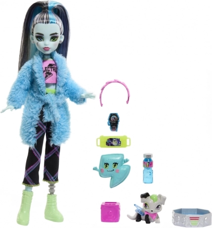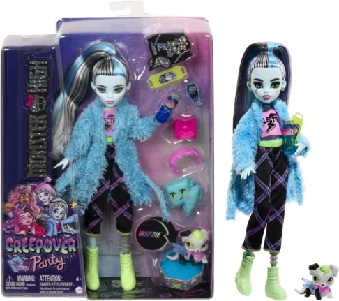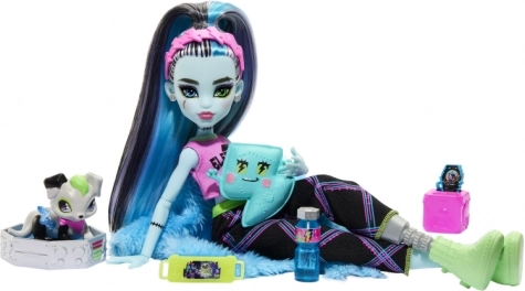 Doživite jezivo zabavnu pidžama avanturu s lutkom MONSTER HIGH Frankie Stein iz kolekcije Creepover Party. Moderna lutka nosi mekanu pahuljastu hoodicu, ružičasti top i karirane tajice, upotpunjene asimetričnim zelenim cipelama i trakicom s munjama. Tu je i zglobno tijelo za poziranje, tematski dodatci za pidžama zabavu te vjerni ljubimac Watzie/Cotoš.