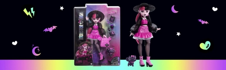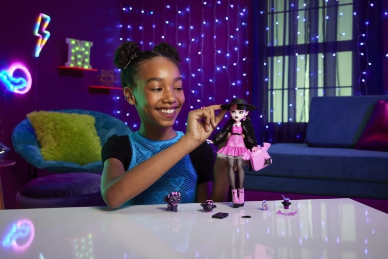 Lutka Draculaura oduševit će razrađenim outfitom u ružičastoj i crnoj boji koji naglašava njezin ikonični, blago gotički izgled. Set upotpunjuju tematske sitnice i vjerni ljubimac s kojima djeca lako osmišljavaju desetke priča. Zahvaljujući zglobovima, lutku je lako pozirati za igru i izlaganje.