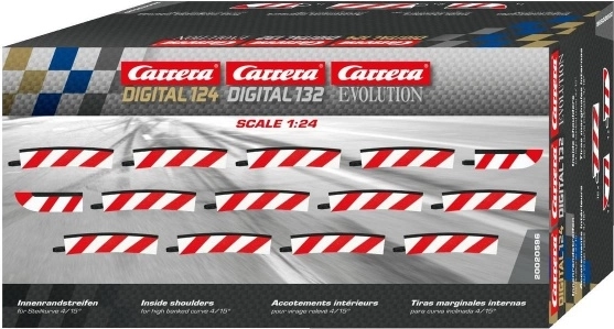 Praktičan set unutarnjih rubnjaka za nakošeni zavoj 4/15° poboljšava stabilnost i protočnost vožnje na autodromima CARRERA EVOLUTION, DIGITAL 132 i DIGITAL 124. U pakiranju je 12 kom rubnjaka s radijusom R4, koji proširuju stazu u unutarnjem dijelu zavoja te povećavaju prianjanje i sigurnost u brzim dionicama.