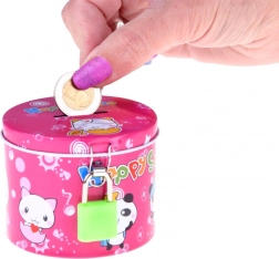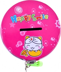 Ružičasta metalna površina s veselim životinjskim motivima i natpisom Happy Smile privlači djecu i potiče pozitivne navike u upravljanju novcem.