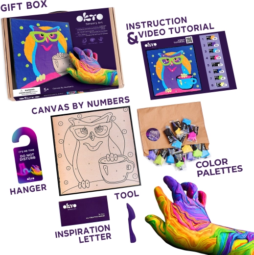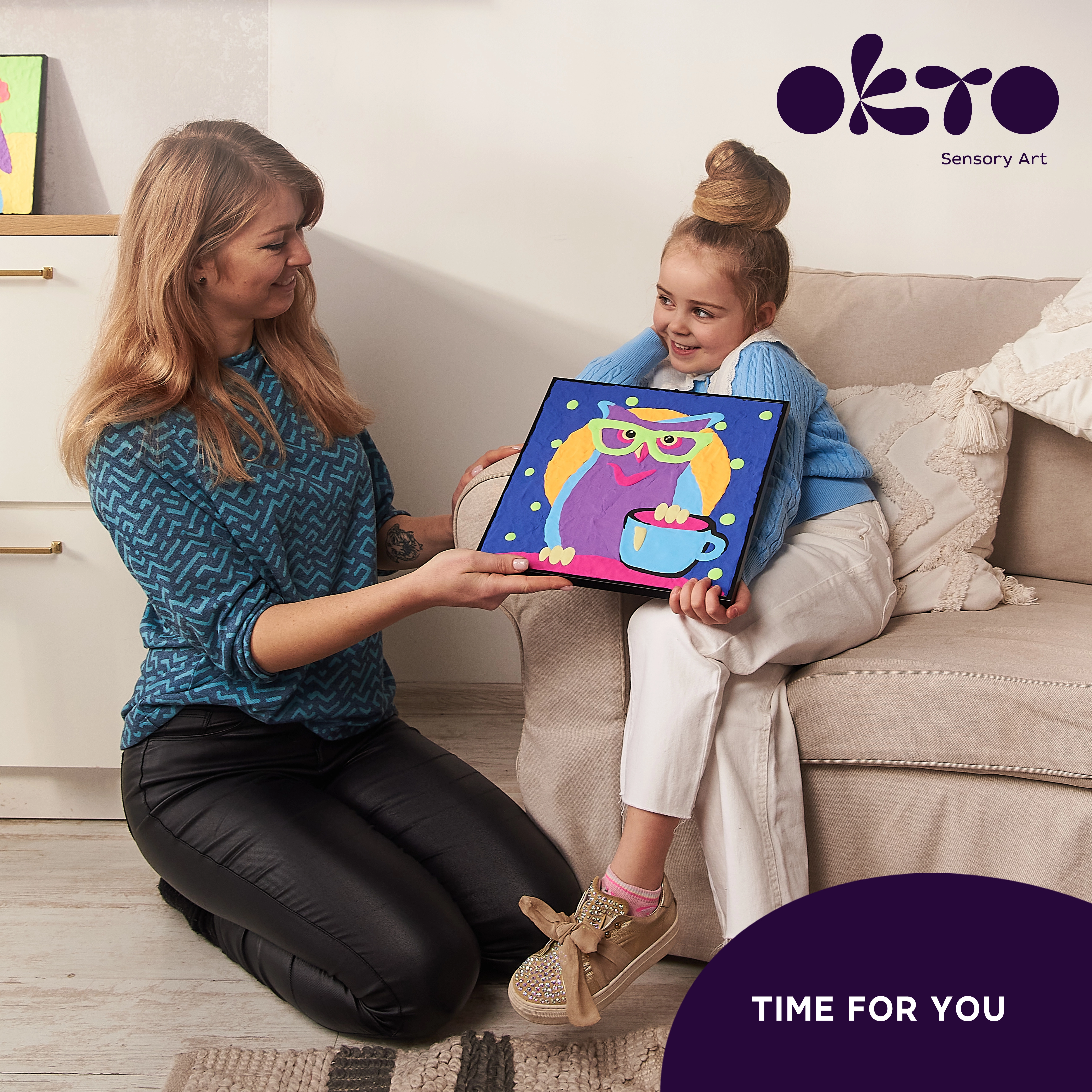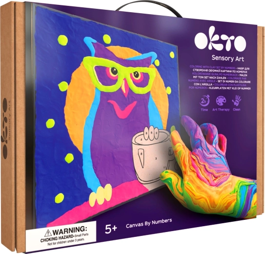 OKTO Sova likovni set. Samoutvrđujuća masa (air clay), slikanje prstima. Veličina platna 29x29 cm. Sadržaj pakiranja – platno, slikovni vodič, alati za oblikovanje, samoutvrđujuća masa.