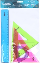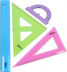 - Sadržaj seta: ravnalo 30 cm (plavo), mali kutomjer (ljubičasti), 2× trokut (ružičasti i zeleni)