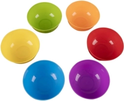 Šarene zdjelice i figurice potiču djecu na prepoznavanje boja i jednostavno računanje kroz igru. Idealno za predškolsku pripremu.
