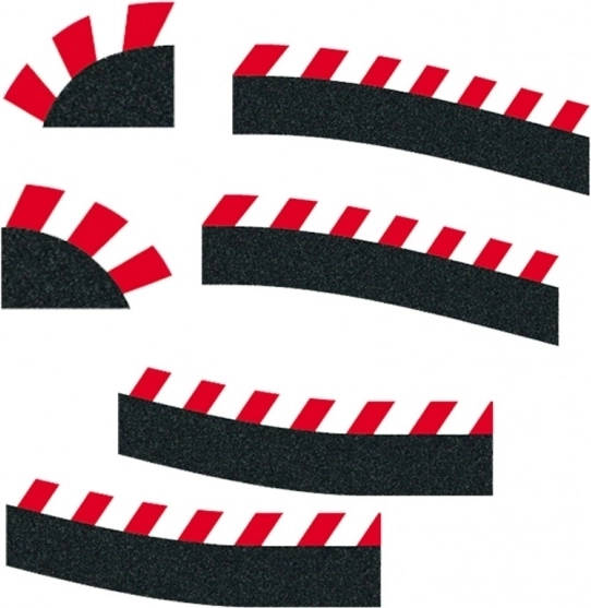 Pakiranje sadrži ukupno 6 komada – 4 rubnika i 2 završetka – koji se lako spajaju na odgovarajuće segmente. Preporučujemo kombinaciju sa segmentima suženje lijevo 30350 i suženje desno 30351 za stvaranje realistične sužene dionice i napetih pretjecanja.