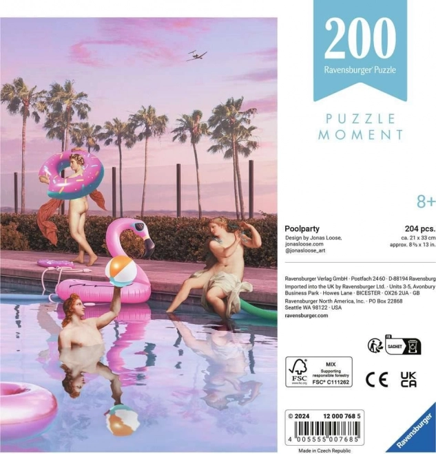 Uživajte u trenucima mira i opuštanja uz slagalicu RAVENSBURGER iz serije Puzzle Moment. Moderan motiv zabava uz bazen, 200 preciznih dijelova i kompaktna veličina složene slike 33 × 21 cm idealni su za kratko, ali ispunjujuće slaganje. Odlično za početnike i iskusne ljubitelje slagalica – RAVENSBURGER kvaliteta jamči savršeno iskustvo.