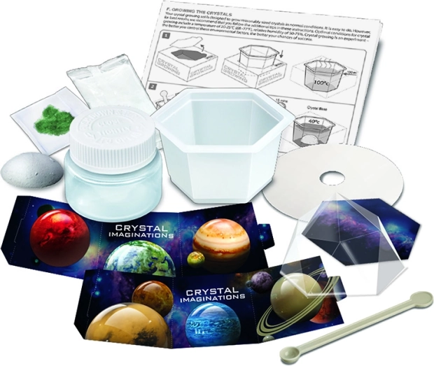 Nakon dovršetka pokusa kristal možete izložiti u prozirnoj vitrini s svemirskim motivom, pa će poslužiti i kao originalna dekoracija dječje sobe. Set razvija strpljenje, moć zapažanja i interes za prirodne znanosti.