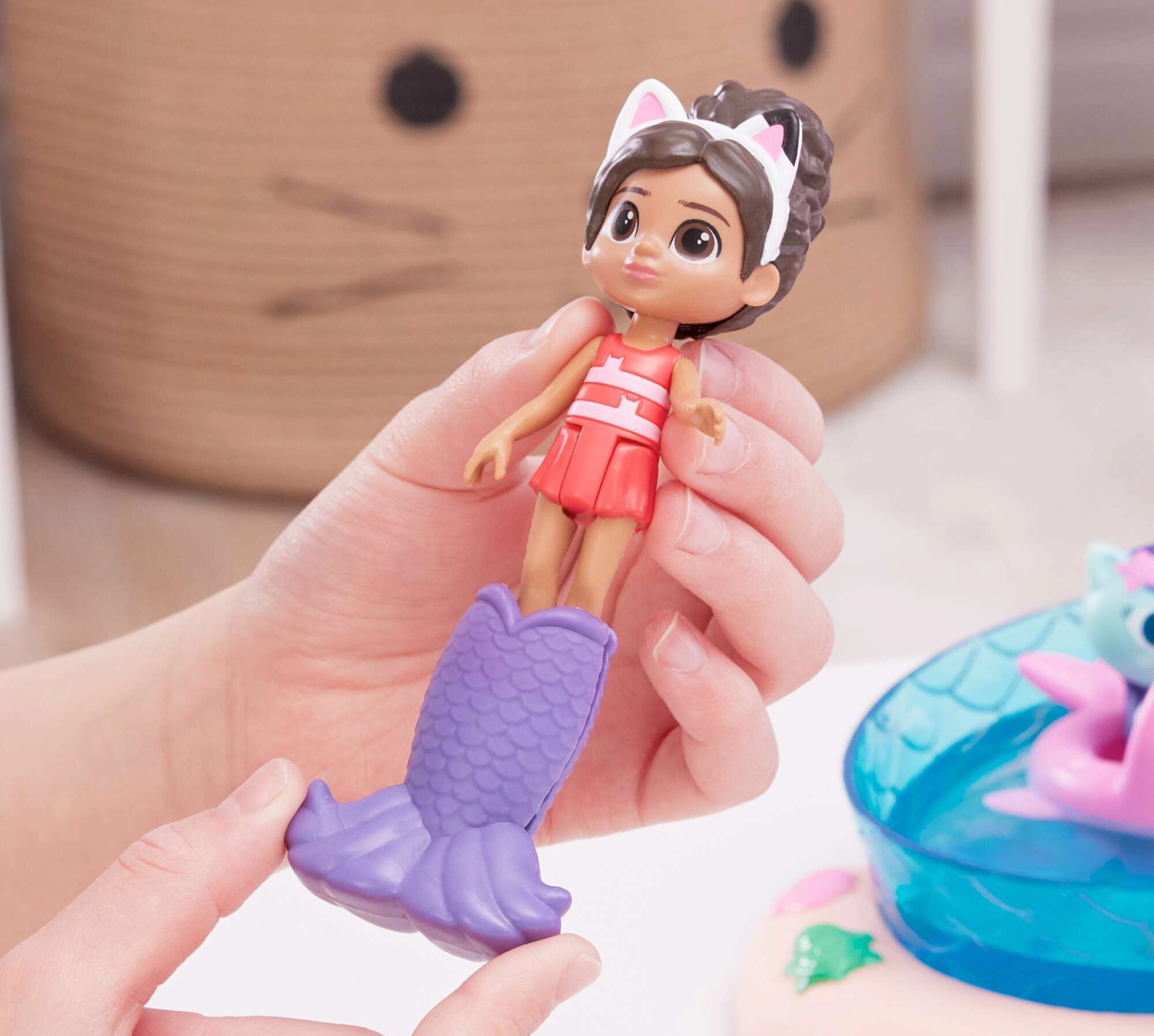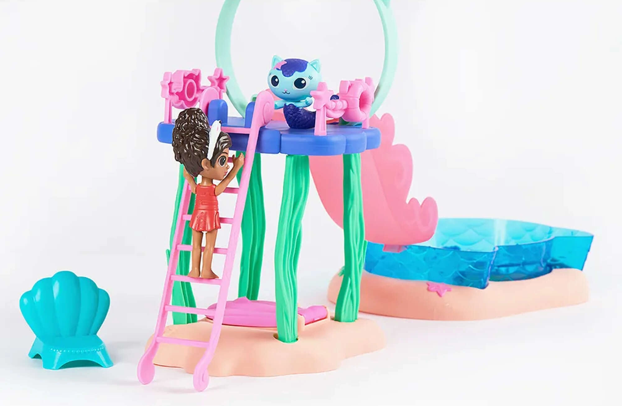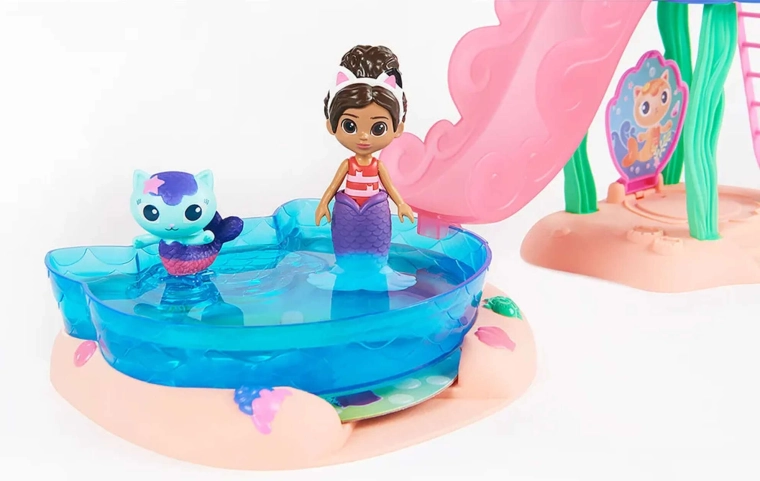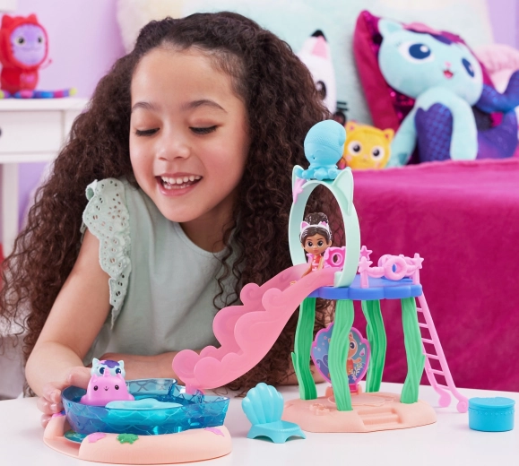 Uđite u svijet Mačje kućice s sjajnim bazenskim setom gdje Gabi i Sirenka klize niz ružičasti tobogan ravno u plavi bazen. Uz raspršivač u obliku hobotnice aktivirajte magičnu promjenu boje na njihovim repnim perajama i otkrijte skriveno iznenađenje u velikoj školjci ispod tobogana.