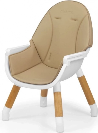 Hranilica se može prilagoditi dobi i visini djeteta zahvaljujući podesivim petotočkastim sigurnosnim pojasima. Također je opremljena mekim ramenim oblogama koje štite od trenja, a presvlaka od eko kože otporna je na zaprljanje. Pladanj s udubljenjem sprječava klizanje predmeta.