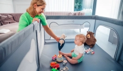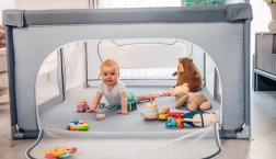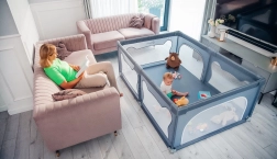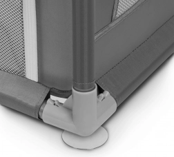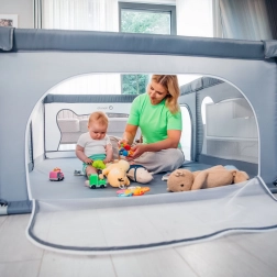 Ogradica nudi sigurno mjesto za igru bez ometajućih elemenata iznutra – svi konstrukcijski dijelovi nalaze se izvana. Mekane mrežaste bočne stranice omogućuju djetetu vježbanje ustajanja, prvih koraka ili okretanja uz minimalan rizik te istodobno pružaju odličnu vidljivost roditeljima. Više i čvrste stranice sprječavaju samostalni izlazak, pa dijete ima čist i zaštićen prostor za svakodnevnu zabavu.