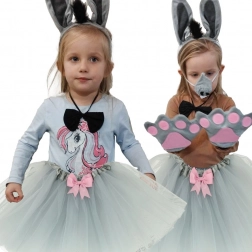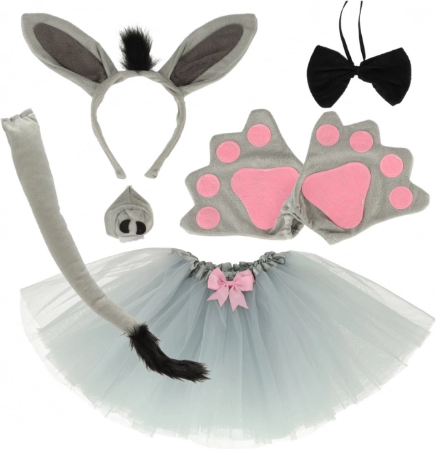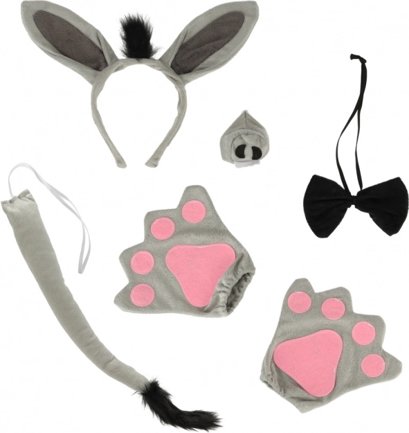 Ovaj kostim dolazi s nekoliko dodataka, uključujući traku za glavu s ušima, rukavice, njušku, rep i leptir mašnu.