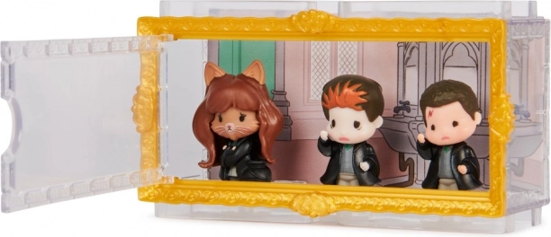 - 3 figurice (Harry Potter, Hermione Granger, Ron Weasley) + 3 postolja, transparentna kutija s dvostranom pozadinom