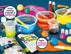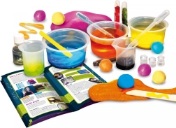 Fascinantan i istodobno zahtjevan komplet s kojim će djeca od ljepljive mase stvarati zabavne i kreativne stvari, uključujući skakajuće loptice, čudovišne stanice, pokretni pijesak, rastezljivi žele ili zabavnu plastelin masu. Proizvod sadrži sigurna reagensna sredstva. Upozorenje: mase mijenjaju boju i skaču! Sadržaj: zaštitne naočale, pipeta, špatula, reagensi, bojila, mjerne posudice, boca, epruvete.