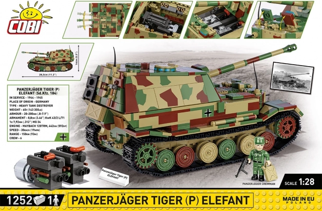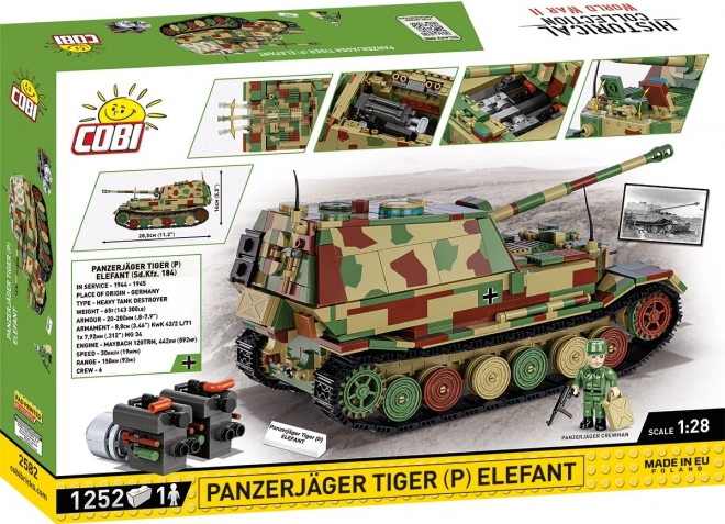 Ovaj precizan COBI set vjerno prikazuje legendarni teški lovac tenkova Elefant, razvijen na podvozju Tiger (P). U paketu ćete pronaći bogate detalje interijera, otvarajuće poklopce i pločicu s nazivom vozila. Svi grafički elementi su tiskani – bez naljepnica – za dugotrajno lijep izgled i kolekcionarsku vrijednost.