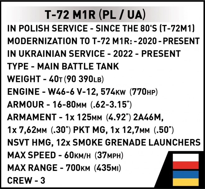 Model se temelji na jednoj od najraširenijih tenkovskih platformi na svijetu i donosi ne samo zabavu, već i spoznaju o povijesti i tehnici. Otvoriv poklopac omogućuje smještaj figure poljskog ili ukrajinskog tenkista, na kupolu možete istaknuti kockaste zastave, a model upotpuniti pločicom s nazivom.