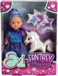 Sjajna plavo‑ljubičasta haljina i usklađena šarena kosa pretvaraju lutku Evi Love u pravu fantazijsku princezu.