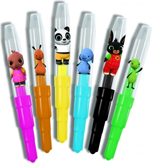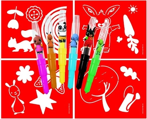 Set puhaćih flomastera BING razveselit će sve male umjetnike. Šest raznobojnih nijansi i tematske šablone omogućuju lako stvaranje originalnih crteža s omiljenim likovima. Jednostavno puhanje kroz flomaster stvara nježne prijelaze i sprej-efekte bez nereda.