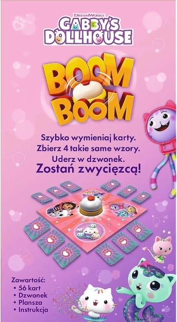 Boom Boom Mačja Kuća Gabi je igra u kojoj svaki igrač igra istovremeno, nastojeći prikupiti 4 iste karte i pobijediti. Igra donosi puno emocija i zabave. Savršena je za obiteljsko druženje ili igranje s prijateljima.