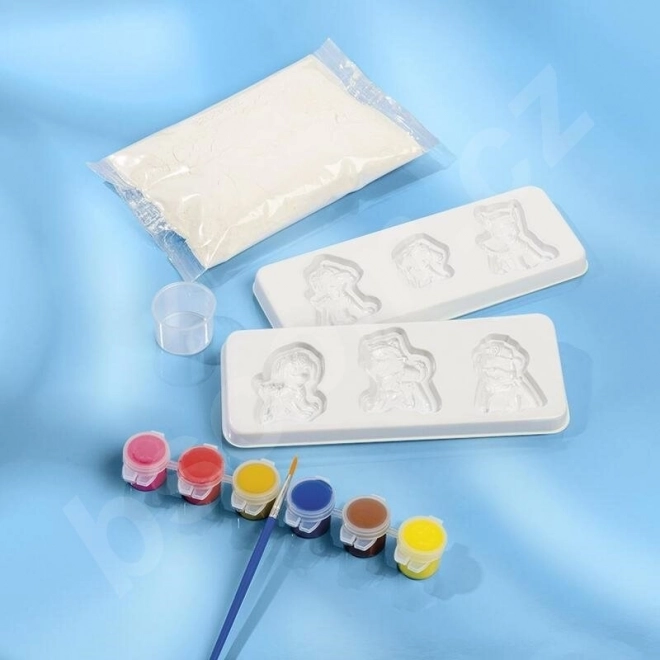 - Sadrži 6 kalupa, gips, mjericu, 6 boja i kist