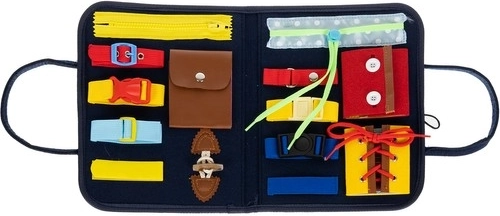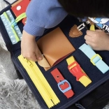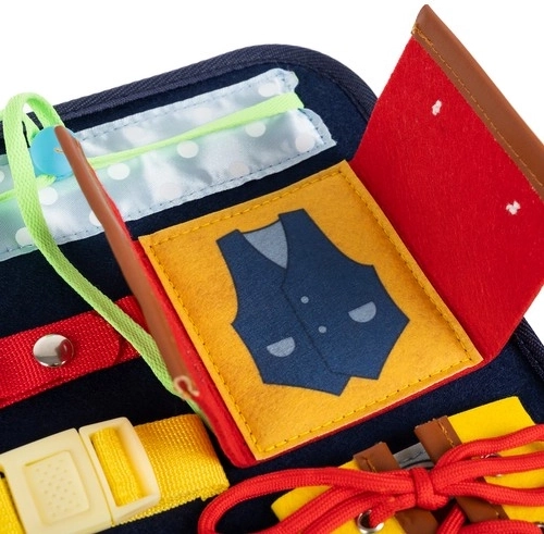 Sadrži 14 raznolikih elemenata, uključujući patentne zatvarače, kopče, gumbe i druge, koji podupiru praktične vještine i samostalnost.