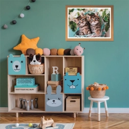 Dva mačića u pletenoj košari s cvijećem stvaraju topao i privlačan prizor koji će djeca rado dovršiti i izložiti.