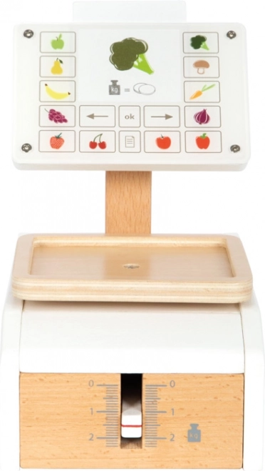 Dječja vaga small foot Fresh idealan je dodatak svakoj dječjoj kuhinjici ili trgovini. Stvarni pomak pokazivača i posude pri opterećenju potiče razumijevanje principa mjerenja težine. Veliki “display” od kvalitetnog akrila otisnut je upravljačkim elementima i motivima voća i povrća, što povećava preglednost i zabavu tijekom igre.