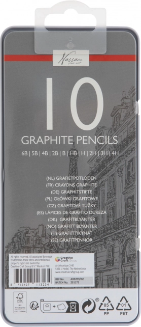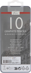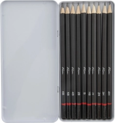 Set od 10 grafitnih olovaka pokriva cijeli raspon za kreativni rad: od mekih za zasićene sjene i ekspresivne poteze do tvrdih za fine detalje i tehničke crte. Priložena metalna futrola štiti olovke pri prenošenju i održava red u atelijeru i školi.