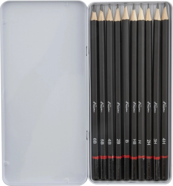 Univerzalni set grafitnih olovaka za skiciranje i crtanje nudi 10 tvrdoća od 6B do 4H. Idealan za umjetnike, studente i dizajnere. Zahvaljujući preglednoj metalnoj futroli sve tvrdoće imate uvijek pri ruci i postižete fino sjenčanje, precizne konture i tehničke linije.