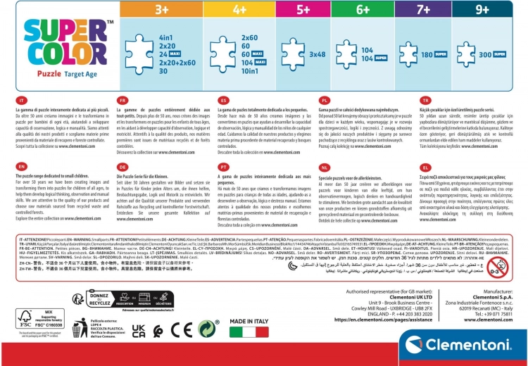 Puzzle marke Clementoni je jedan od najvećih proizvođača na svijetu koji nudi širok izbor kvalitetnih puzzli, uključujući 3D izvedbe i originalne kocke iz Disney kolekcije. Glavne značajke ovih puzzli su izvrsna oštrina i kvaliteta ispisa, kao i savršeno pristajajući dijelovi. Isporučuje se u robusnoj i elegantnoj kutiji.