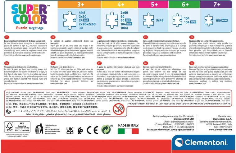 Zahvaljujući promišljenom dizajnu i kvalitetnim materijalima slagalica potiče razvoj fine motorike, koncentracije i strpljenja. Tehnologija tiska CLEMENTONI donosi sjajne i postojane boje koje će razveseliti pri svakom slaganju.