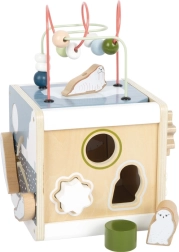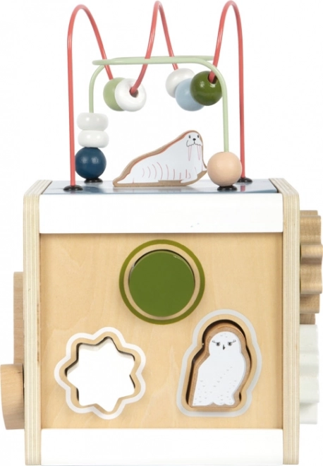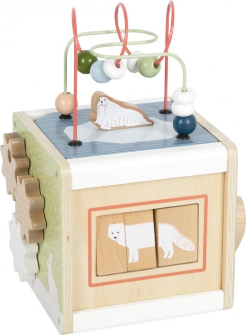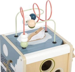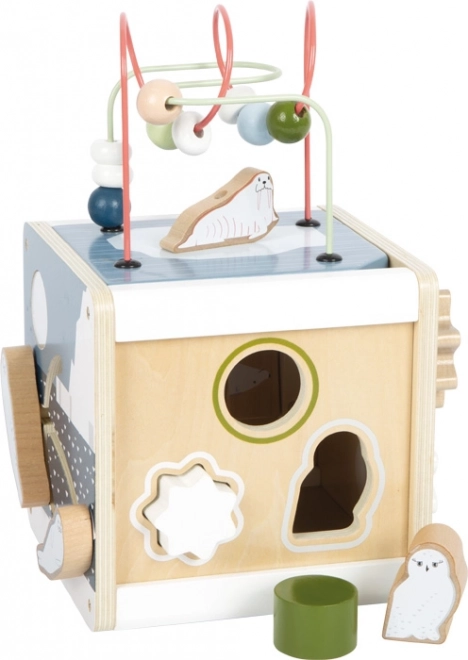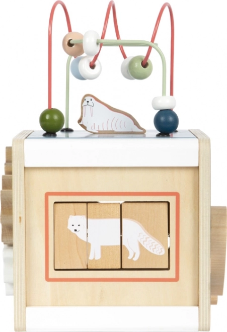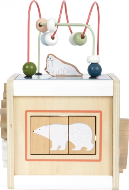 Ova višenamjenska motorička kocka s motivima arktičkih životinja (polarni medvjed, tuljan, morž i drugi) promišljena je edukativna igračka za djecu od 12 mjeseci. Zahvaljujući dvjema stazama s perlicama, umetalici oblika, kliznim labirintima, rotirajućim pločicama i zupčanicima, djeca razvijaju koordinaciju oko–ruka, strpljenje i prostorno opažanje. Odvojivi poklopac omogućuje jednostavno spremanje dijelova u unutarnji prostor.