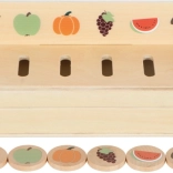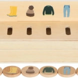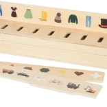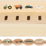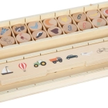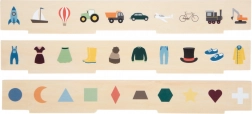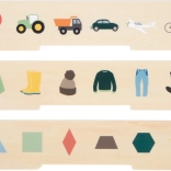 Pametna drvena igračka za djecu od 3 godine koja spaja sortiranje, umetanje i učenje riječi. Sadrži tri obostrana panela i 60 slikovnih žetona na teme prijevoz, životinje, brojevi, oblici, odjeća, voće i povrće. Tijekom igre djeca razvijaju finu motoriku, prepoznavanje boja i oblika te prirodno šire rječnik. Sigurno spremanje osigurava drvena kutija s 10 pretinaca i elastičnim kopčama – idealno i za putovanja.